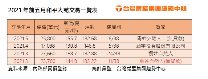 百家樂表/2021年前五月和平大苑交易列表。台灣房屋集團趨勢中心彙整提供