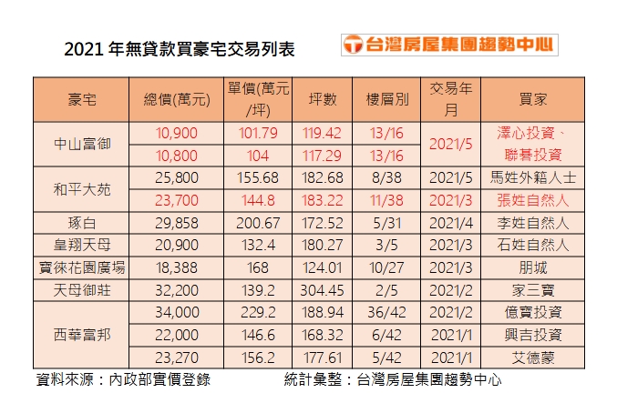 表/2021年無貸款豪宅交易。台灣房屋集團趨勢中心彙整提供